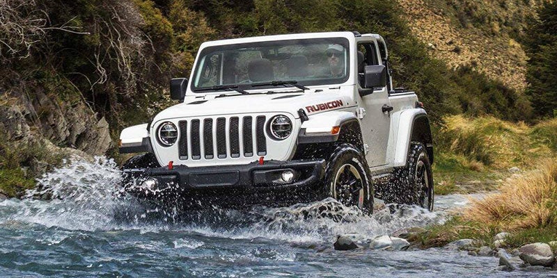 Four-wheel drive is standard, and you can choose from three different systems. Selec-Trac adapts to changing road conditions automatically, only delivering power to all four wheels when needed. You can choose Command-Trac to add towing and rock crawling modes, and the Rock-Trac system can adjust the Wrangler's driving mode, torque distribution, shock sensitivity, and more. The Wrangler has plenty of ground clearance and high intakes for crossing creeks and streams, and it can easily maneuver around fallen logs, boulders, and other obstacles on trails. With the automatic transmission, you'll get Selec-Speed Control, an off-road version of cruise control.