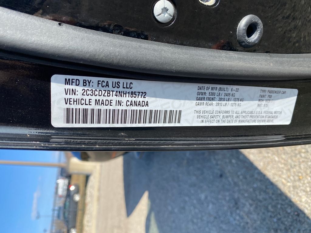 ONE OWNER, NO ACCIDENTS, 1-Yr SiriusXM Guardian Trial, 276 Watt Amplifier, 4G LTE Wi-Fi Hot Spot, 506 Watt Amplifier, 6 Premium Alpine Speakers, 8.4 Touchscreen Display, 9 Amplified Speakers w/Subwoofer, Air Conditioning, Alpine Audio Group w/Subwoofer, Apple CarPlay, Apple CarPlay/Android Auto, Black Fuel Filler Door, Black Grille w/Bezel, Blacktop Package, Blacktop R/T Badge, Blind Spot & Cross Path Detection, Body Color Exterior Mirrors, Challenger Blacktop Grille Badge, Compass, Compass Gauge, Deluxe Security Alarm, Dodge Performance Pages, Door Trim Panel w/Ambient Lighting, Driver Convenience Group, Dual front impact airbags, Dual front side impact airbags, Exterior Mirrors w/Heating Element, For Details, Visit DriveUconnect.com, For More Info, Call 800-643-2112, Front fog lights, Garage door transmitter, Gloss Black I/P Cluster Trim Rings, Google Android Auto, GPS Antenna Input, HD Radio, Heated Steering Wheel, HEMI Blacktop Fender Badge, High-Intensity Discharge Headlamps, Integrated Center Stack Radio, Integrated Voice Command w/Bluetooth®, Line Lock, Low tire pressure warning, Media Hub (2 USB, AUX), Outside temperature display, Overhead airbag, ParkView Rear Back-Up Camera, Plus Package, Power Multi-Function Foldaway Mirrors, Power Tilt/Telescope Steering Column, Premium-Stitched Dash Panel, Quick Order Package 28H, Radio: Uconnect 4C w/8.4 Display, Rear Black Spoiler, Rear window defroster, Rhombi 2-Pc Wheel Center Cap, Rhombi Illum Air Catcher Headlamp, Satin Black Dodge Tail Lamp Badge, Shark Fin Antenna, SiriusXM Radio Service, SiriusXM Satellite Radio, Speed control, Steering wheel mounted audio controls, Surround Sound, Traction control, USB Host Flip, Wheels: 20 x 8.0 Black Noise Painted, Wheels: 20 x 8.0 Machined w/Granite Pocket. Pitch Black Clearcoat 2022 Dodge Challenger R/T RWD 8-Speed Automatic HEMI 5.7L V8 Multi Displacement VVT